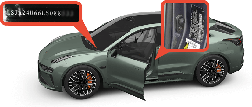 每辆车都会有唯一的VIN码,一般位于汽车主驾前方前挡风玻璃下和主驾车门框处(如图)